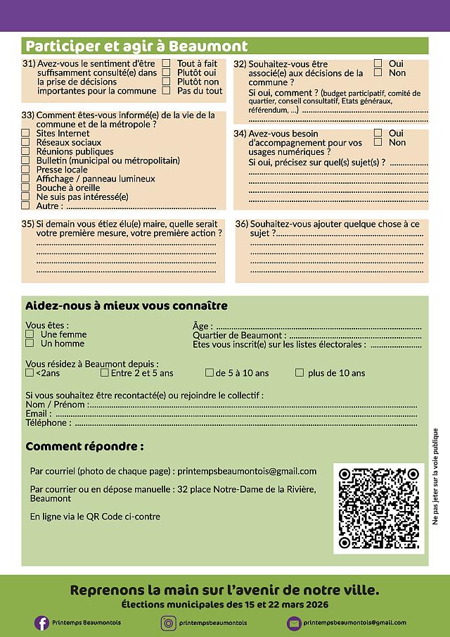 N’hésitez pas à le faire suivre aux Beaumontois et Beaumontoises autour de vous, qu’ils soient nouveaux sur la commune, installés depuis longtemps, jeunes et moins jeunes, actifs et retraités, toutes les participations nous intéressent !