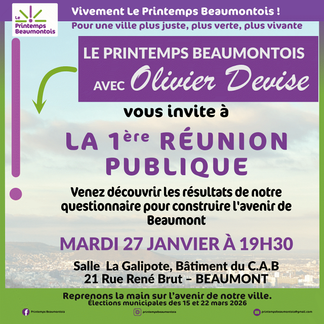 Élections MunicipalesEn plus des 8 réunions de quartier, le collectif « Le Printemps Beaumontois » a planifié trois dates pour des réunions publiques et échanger avec les habitants.