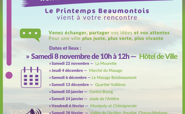 Les membres du collectif « Le Printemps Beaumontois » vont à la rencontre des habitants de Beaumont lors de réunion de quartier. Date des (…)