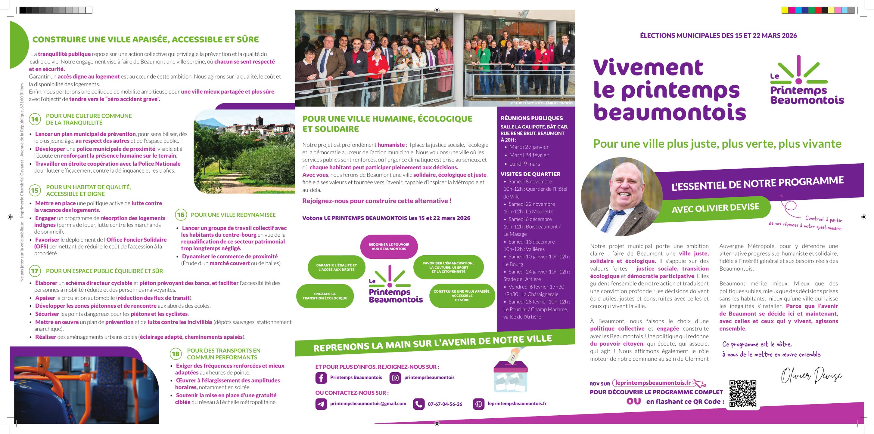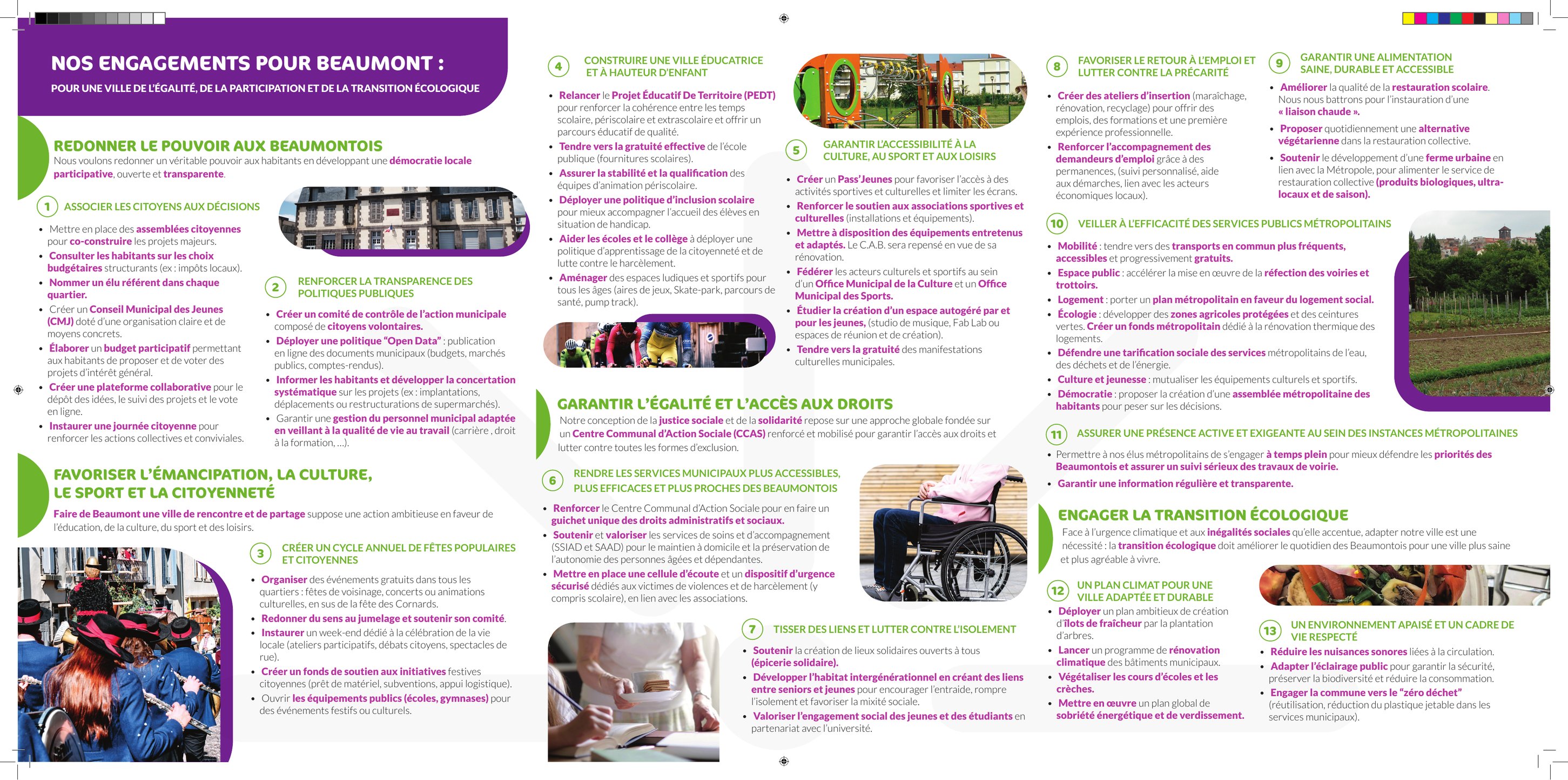 Avec vous, nous ferons de Beaumont une ville solidaire, écologique et juste, fidèle à ses valeurs et tournée vers l’avenir, capable d’inspirer la Métropole et au-delà.