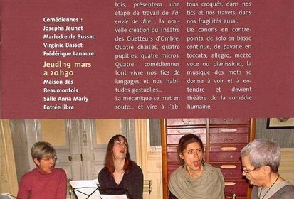 CultureJeudi 19 mars à 20 heures 30 à la salle Anna Marly à la Maison des Beaumontois, la compagnie Ethic et Toc présentera un étape de son travail “J’ai envie de dire ...”, création du Théâtre des Guetteurs d’Ombre.