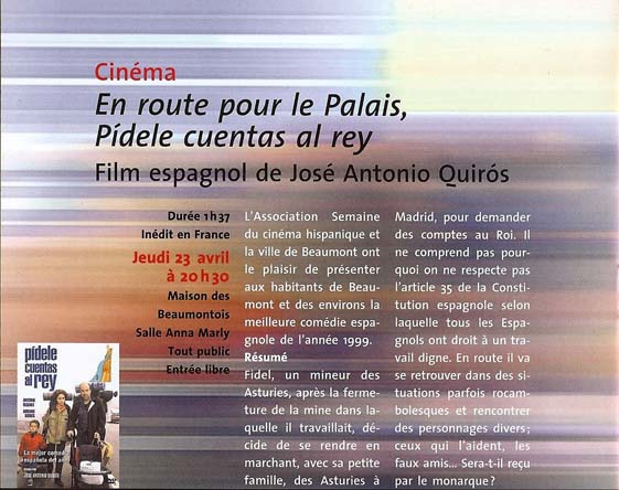 CultureJeudi 23 avril à 20 heures 30 à la salle Anna Marly à la Maison des Beaumontois, projection de la meilleure comédie espagnole de l’année 1999, “En route pour le palais, Pídele cuentas al rey”. Projection organisée par l’association Semaine du Cinéma Hispanique et la Ville de Beaumont .