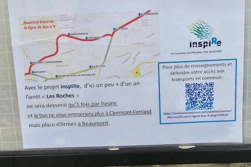 InspiRe : une ligne 4 modifiée, ne passant plus par le haut de l’avenue du Mont-Dore et laissant sans solution de transport rapide vers le centre de Clermont un important secteur de Beaumont. Cette solution a été validée par l’exécutif en février 2023, en catimini, sans en parler ou en discuter en Conseil Municipal et encore moins avec vous !