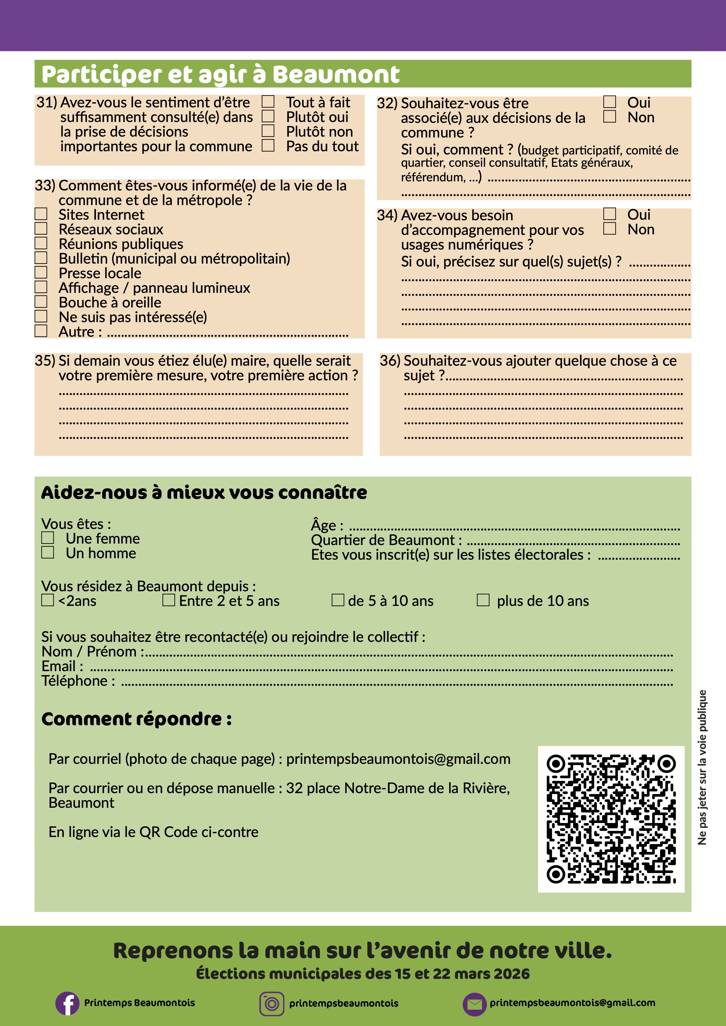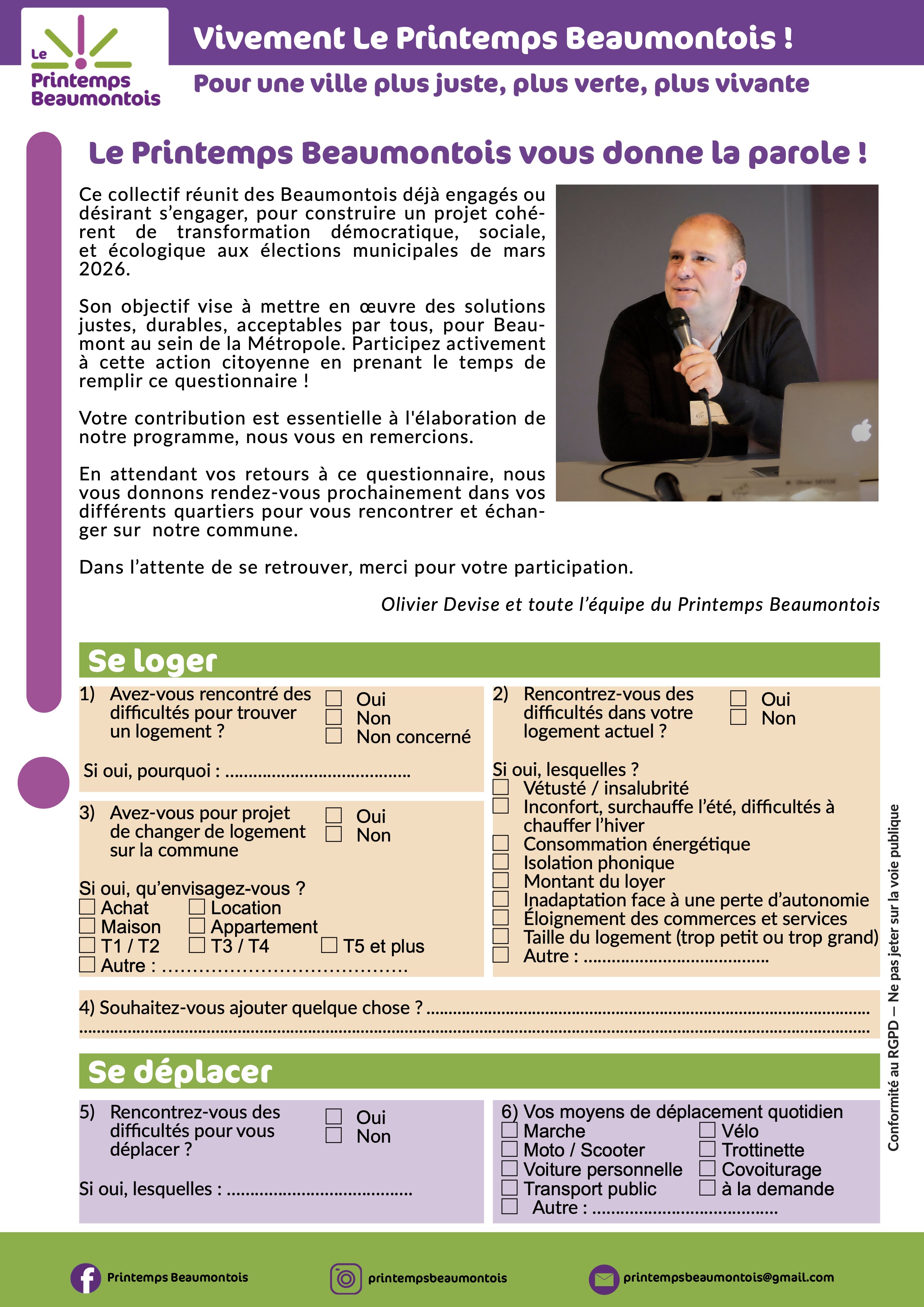 N’hésitez pas à le faire suivre aux Beaumontois et Beaumontoises autour de vous, qu’ils soient nouveaux sur la commune, installés depuis longtemps, jeunes et moins jeunes, actifs et retraités, toutes les participations nous intéressent !